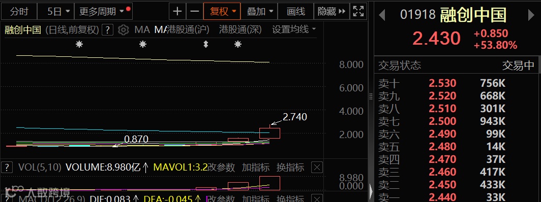 融创中国更是强劲。作为地产“三仙”之首,融创中国股价两天实现翻倍,股价从昨天的1.3港元附近,今天冲高至2.74港元。