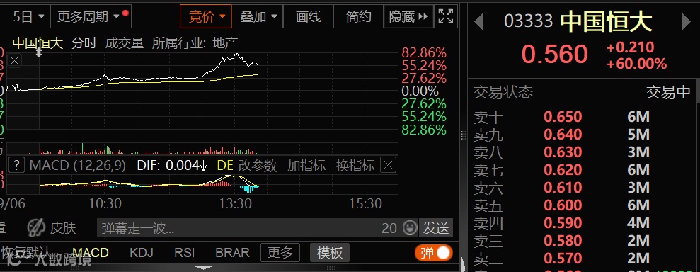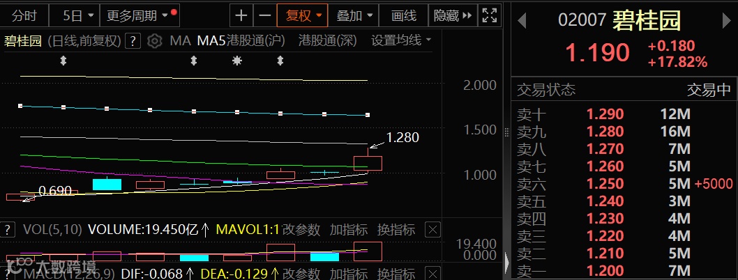 碧桂园这两天的股价亦是大涨。该公司在9月5日完成了两笔合计2250万美元的境外债票息的支付,继续保持仍未实质性违约的状态。分析人士认为,随着市场企稳回升,部分企业债务重组出现重大进展,销售数据明显回暖,港股内资地产股或迎来估值重构。