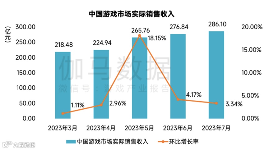 到了7月份,游戏市场延续了回暖趋势。伽马数据发布的报告显示,2023年7月,中国游戏市场实际销售收入286.1亿元,环比上升3.34%,同比大幅增长37.49%。
