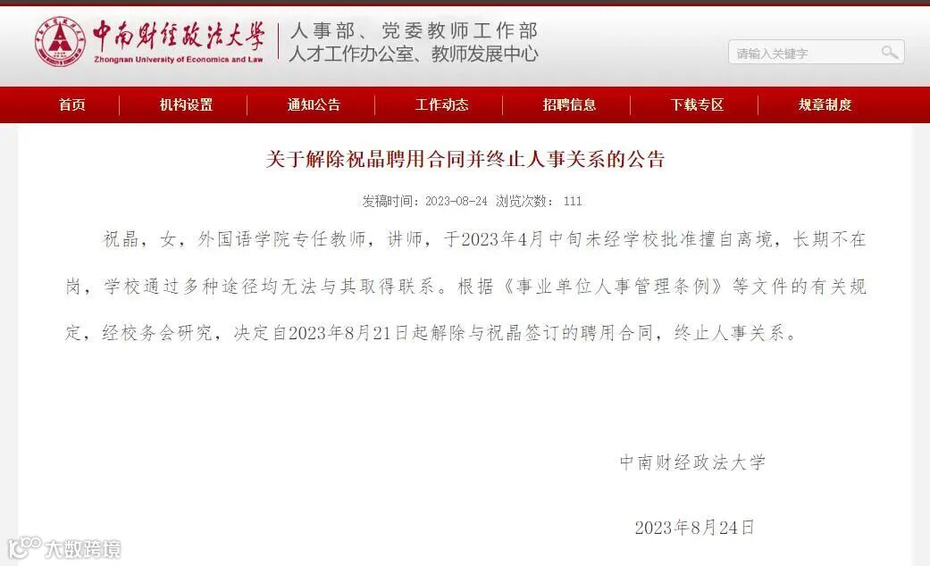 近日,中南财经政法大学发布关于解除祝晶聘用合同并终止人事关系的公告。