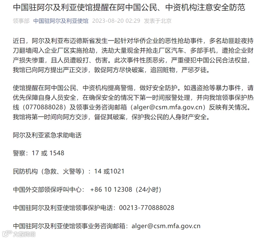 据中国驻阿尔及利亚使馆消息,近日,阿尔及利亚布迈德斯省发生一起针对华侨企业的恶性抢劫事件,多名劫匪趁夜持刀翻墙闯入企业厂区实施抢劫,企业财产损失惨重,且人员遭殴打、伤害。此次事件性质恶劣,严重侵犯中国公民合法权益,中使馆已向阿方提出严正交涉,敦促阿方尽快破案,追回赃物,严惩歹徒。