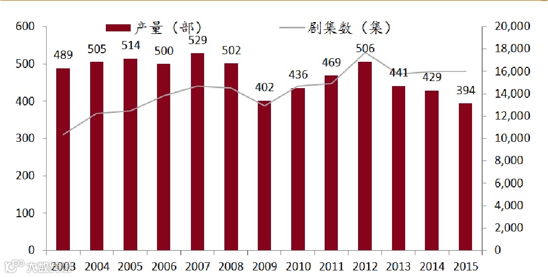 根据广电总局的数据显示,2015年全年全国共计生产完成并获得发行许可的剧目共计394部,较2014年的429部有一定下滑,但是集数却由15983集上升至16540集,说明单部剧时长在增加,说明了我国电视剧作产生了由量转质的转变。