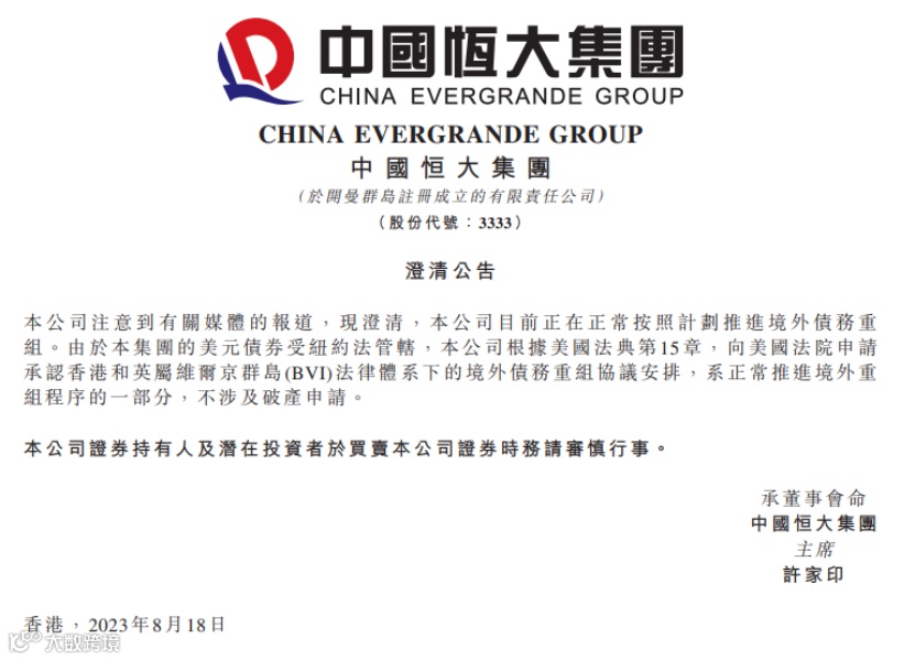 8月18日,恒大在收盘后发布相关澄清公告称,该公司目前正在正常按照计划推进境外债务重组。由于集团的美元债券受纽约法管辖,向美国法院申请承认中国香港和英属维尔京群岛(BVI)法律体系下的境外债务重组协议安排,系正常推进境外重组程序的一部分,不涉及破产申请。