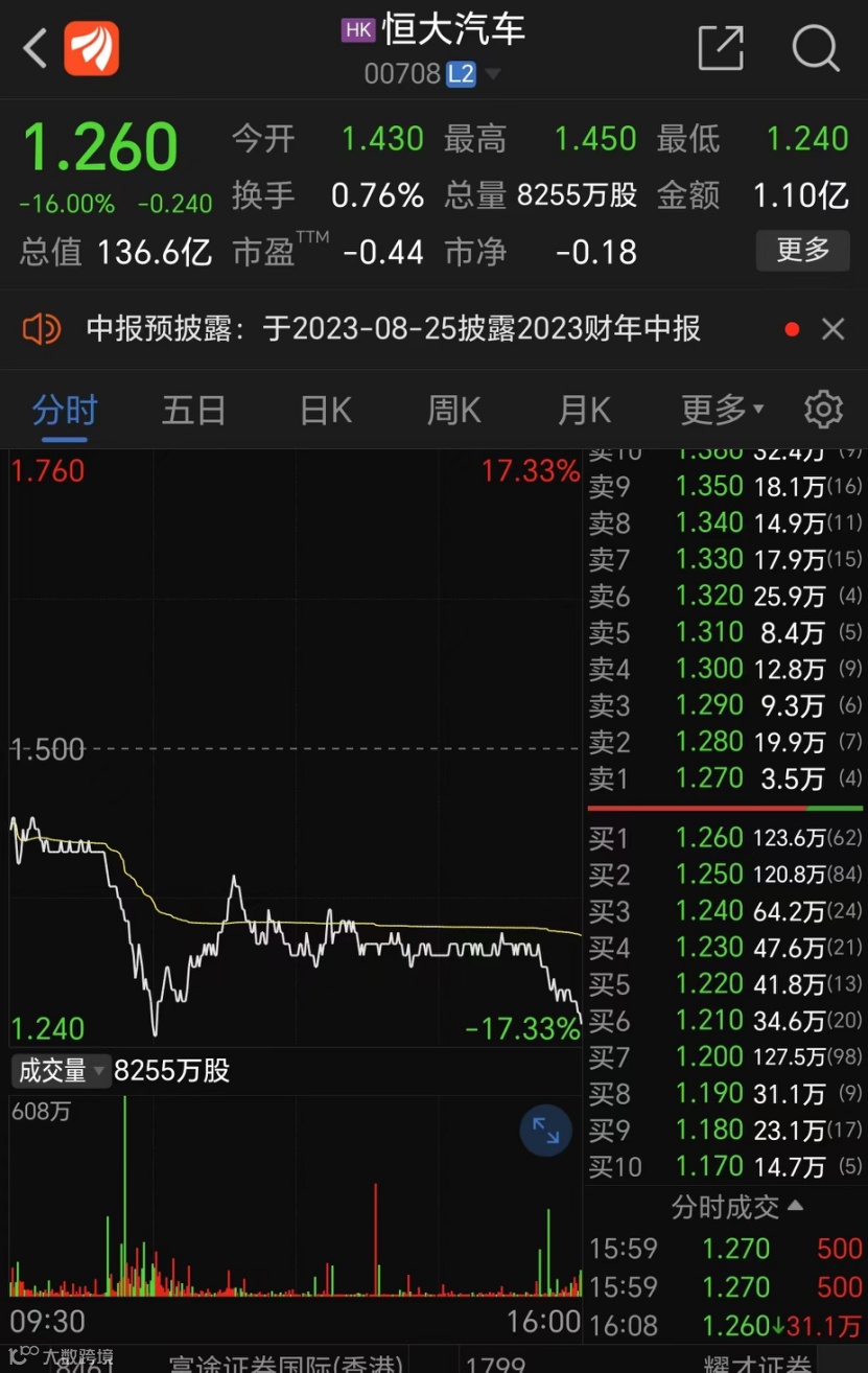 外媒的消息被国内媒体转载后迅速发酵登上热搜。8月18日,恒大系股票恒大汽车和恒大物业开盘均下跌超15%。截至收盘,恒大汽车报收1.26港元/股,下跌16%;恒大物业报收0.6港元/股,下跌9.09%。