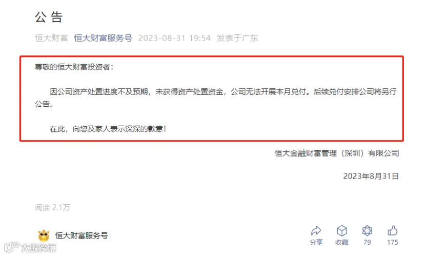 8月31日,恒大财富官微发布公告称,因该公司资产处置进度不及预期,未获得资产处置资金,该公司无法开展本月兑付,后续兑付安排将另行公告。