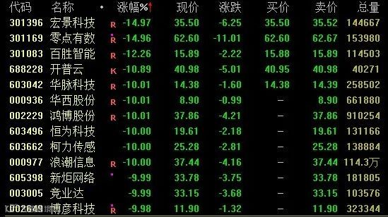 AI、算力等TMT板块盘中大幅下挫,截至收盘,零点有数大跌约15%,鸿博股份、浪潮信息、柯力传感、竞业达、新炬网络等跌停,工业富联跌9.4%,寒武纪、中科曙光等跌超6%。