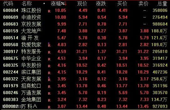 地产板块今日强势拉升,截至收盘,珠江股份、中迪投资、京投发展等涨停,大龙地产涨超7%,特发服务涨超4%,招商蛇口、万科A等涨超3%。