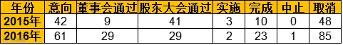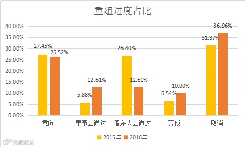 此外,去年和今年的意向和取消阶段所占比例都较高,加起来都超过了五成,这意味着不少重组项目要么光说不练,要么无疾而终。
