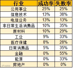 分行业看,公用事业类企业成功率最高,有25%的企业成功,也有25%的企业失败。金融类企业失败率最高,为55%,而且目前还未有成功的案例。不过,以上两类企业都存在样本量过少的问题。信息技术类企业虽然成功的数量多,但失败概率比成功概率大很多。