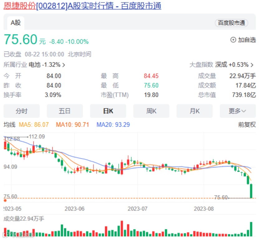 在公募巨头集体自购的利好支撑下,沪深指数在8月22日强劲翻红,在个股集体走强的背景下,新能源板块却略显孤独,在基金重仓股恩捷股份跌停收盘的阴影下,A股新能源板块集体走弱。