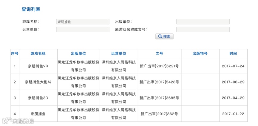 国家新闻出版署官网信息显示,该游戏于2017年6月29日获得版号。除该游戏外,深圳维京人还持有《亲朋捕鱼》《亲朋捕鱼3D》《亲朋捕鱼VR》等相关捕鱼游戏产品版号。