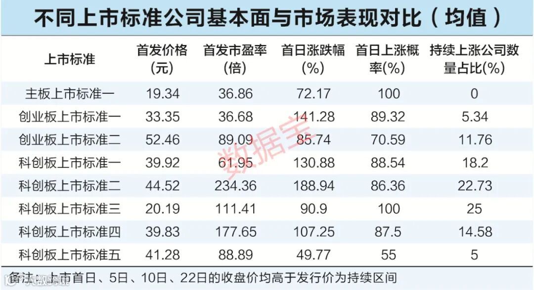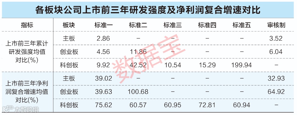 统计显示,财务方面,以创业板上市标准二上市的公司前三年净利润复合增速平均超100%,是标准一公司的2倍多;科创板上市标准四公司净利润复合增速均值超过标准二、三、五公司。