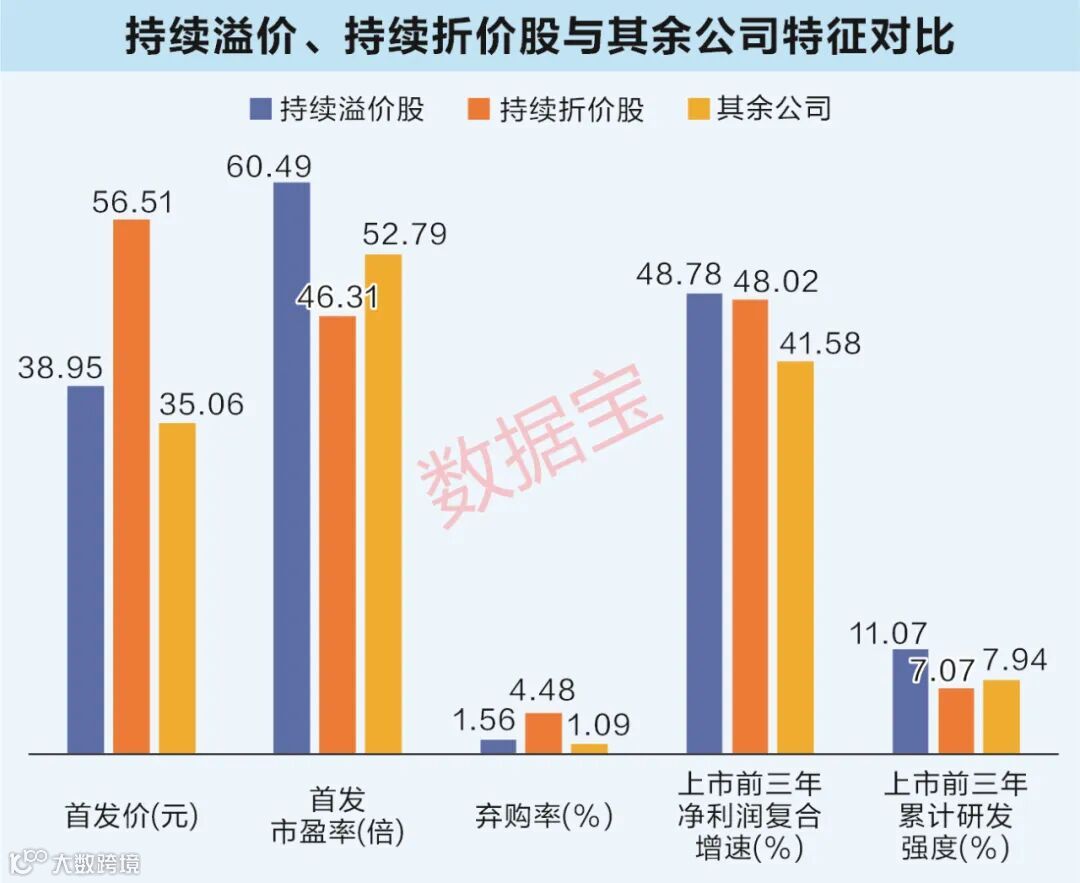 对比持续溢价股、持续折价股及其余公司的特征来看,首先,持续溢价股平均首发价远低于持续折价股,但超过除去持续折价、持续溢价以外的公司(简称“其余公司”);其次,持续溢价股平均首发市盈率超过持续折价股、其余公司。另外,持续溢价股平均弃购率1.56%,持续折价股平均弃购率接近4.5%,或与发行价较高有关。从业绩增速来看,持续溢价股上市前三年净利润复合增速超过持续折价股及其余公司,前者接近49%。