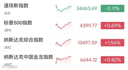当地时间8月21日,美股三大股指涨跌不一,纳指连跌四日之后反弹。截至收盘,道指跌0.11%,报34463.69点;标普500指数涨0.69%,报4399.77点;纳指涨1.56%,报13497.59点。