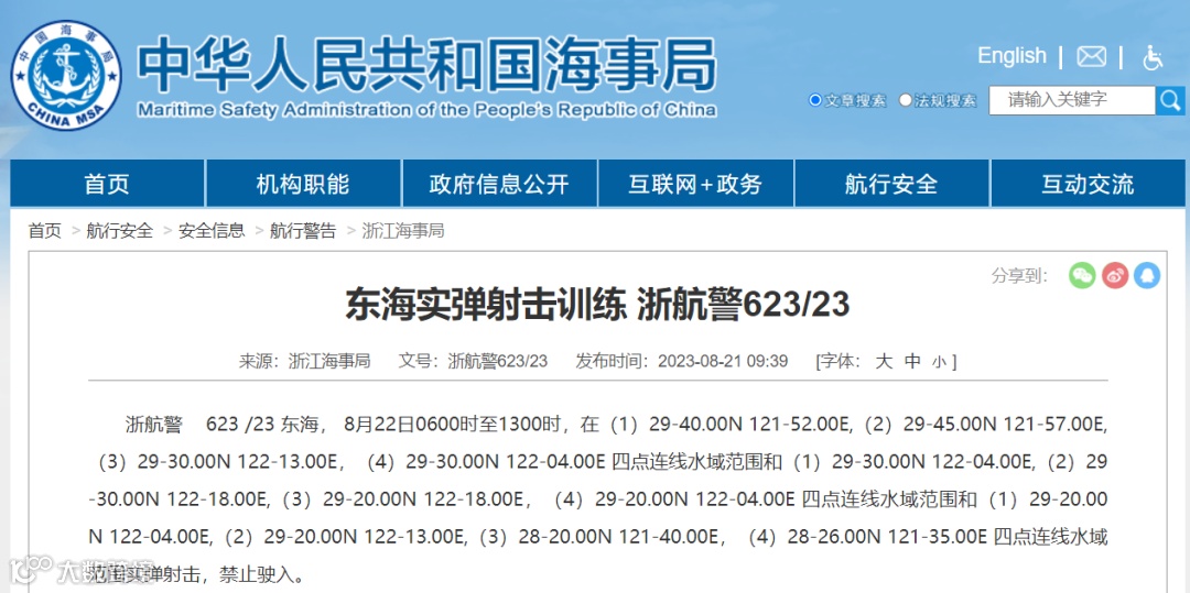 浙航警 623 /23 东海,8月22日0600时至1300时,在(1)29-40.00N 121-52.00E,(2)29-45.00N 121-57.00E,(3)29-30.00N 122-13.00E,(4)29-30.00N 122-04.00E 四点连线水域范围和(1)29-30.00N 122-04.00E,(2)29-30.00N 122-18.00E,(3)29-20.00N 122-18.00E,(4)29-20.00N 122-04.00E 四点连线水域范围和(1)29-20.00N 122-04.00E,(2)29-20.00N 122-13.00E,(3)28-20.00N 121-40.00E,(4)28-26.00N 121-35.00E 四点连线水域范围实弹射击,禁止驶入。