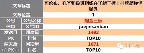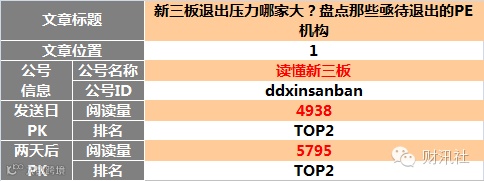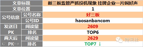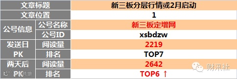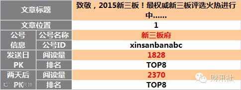 一日定座次,三日分高下。由@财汛社(ID:caixunshe)独家发布的《新三板微信阅读榜》以文章发送日的阅读量作为排名依据,而以第三天中午的阅读量数据作为文章可读性和话题性的孰优孰劣之参考,同时也体现公众号用户的活跃度和粘性。