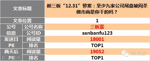 【原创榜TOP10】@三板富(ID:sanbanfu123)的《新三板“12.31”惨案:至少九家公司尾盘被闷杀 做市商是你干的吗?》排名榜首,三天后依然已巨大优势领军,其生动富有冲击力的标题对阅读量加分不少,其内容由热点--(A股“熔断”,各色人等也提前下班了)引入思索,深刻分析了缘由,其个人论点鲜明,结论明确:从尾盘走势来看,这次集体砸盘不是偶然。