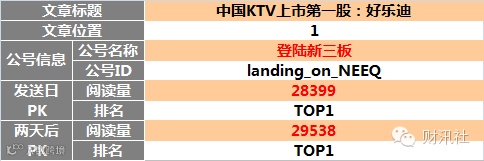 【转载榜TOP10】@登陆新三板(ID:landing_on_NEEQ)的《中国KTV上市第一股:好乐迪》魁首,此文章转载频率很高,社掌只截取了排名第一的@登陆新三板,其后@新三板聚乐部 @红鲱鱼新三板 @新三板观察 @投资新三板 虽阅读量进前十也只能排除了。《熔断机制面前,新三板优越感爆棚,你让纳斯达克咋想?》和《新三板分层行情或2月启动》2文也只截取了阅读量靠前的@新三板论坛(ID:zqsbxsb)和@新三板定增网(ID:xsbdzw)的!两天后@新三板小兵(ID:xinsanbanxiaobing)的《2015年新三板的奇葩事儿你知道多少?》由第5名蹿升至第2名,后劲十足!