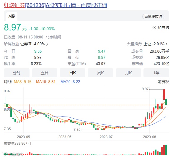 巧合的是,红塔证券的股价这两天也大起大落。8月10日,红塔证券涨停,而8月11日红塔证券股价则以跌停报收。