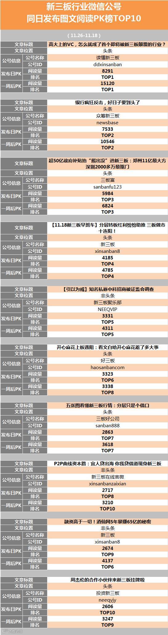国内首家专业的新三板数字化投融传播平台——财汛社的运营团队(人称“社掌”),于2015年11月20日起推出独家特色产品——新三板行业微信公号同日发布图文阅读PK榜TOP10。