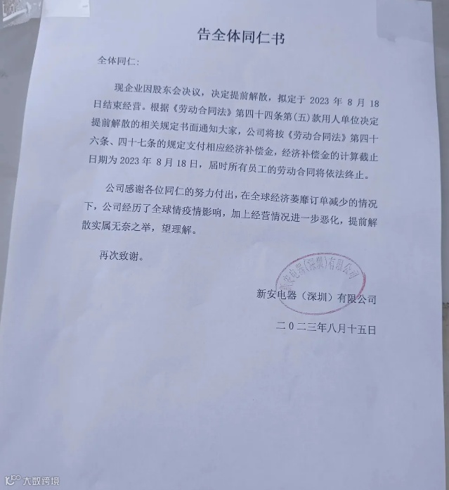 8月15日,一张新安电器(深圳)公司发布的“告全体同仁书”在网络平台广泛传播。
