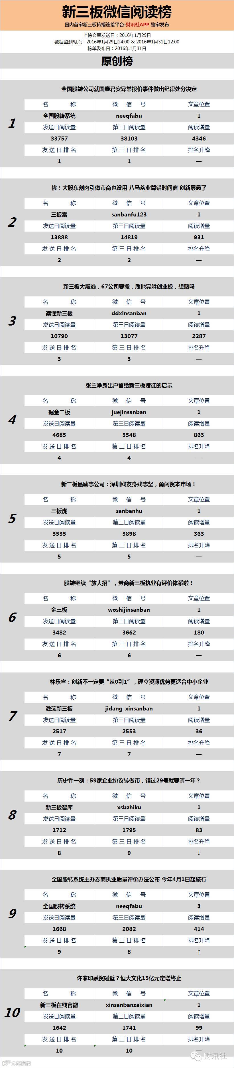 今日《新三板微信阅读榜》文章为上榜公众号于2016年1月29日发送。文章信息摘抄如下: