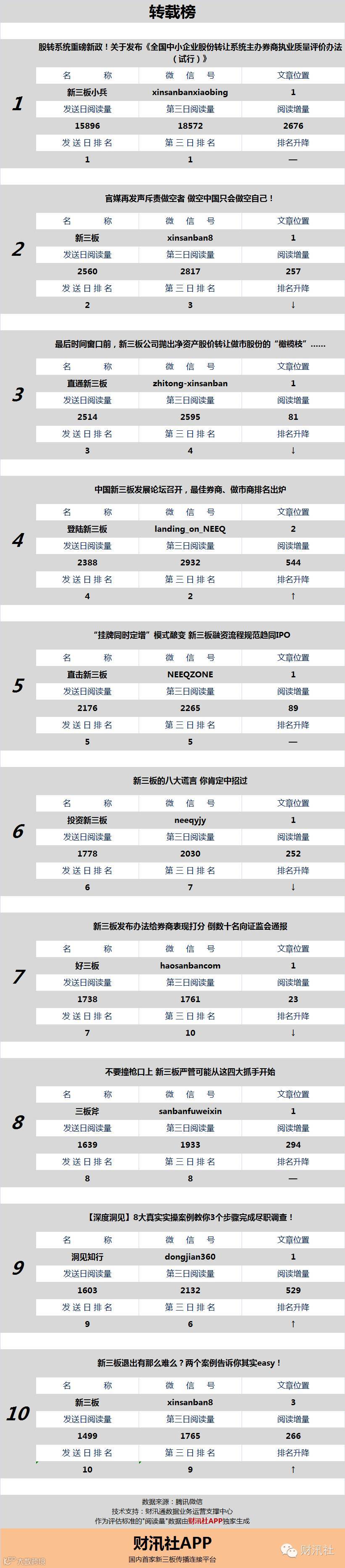 一日定座次,三日分高下。由【财汛社APP】官方订阅号@财汛社(微信号:caixunshe)独家发布的《新三板微信阅读榜》以文章发送日的阅读量作为排名依据,而以第三天中午的阅读量数据作为文章可读性和话题性的孰优孰劣之参考,同时也体现公众号用户的活跃度和粘性。