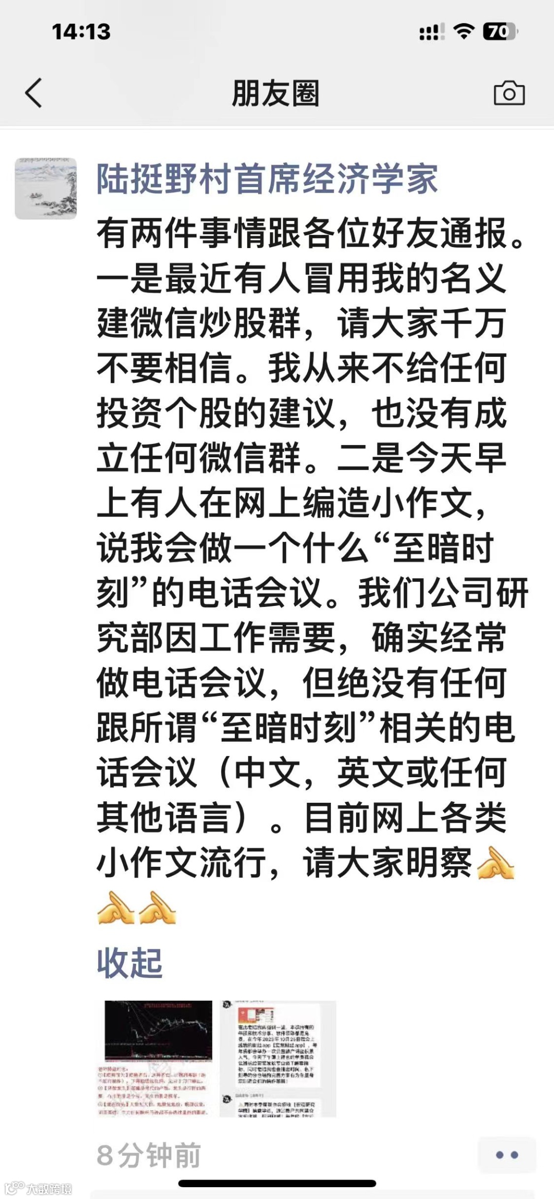 券商中国记者从接近陆挺的人士处求证了解到,他在微信朋友圈上郑重声明,既没有成立微信炒股群,也没有任何跟所谓“至暗时刻”相关的电话会议。
