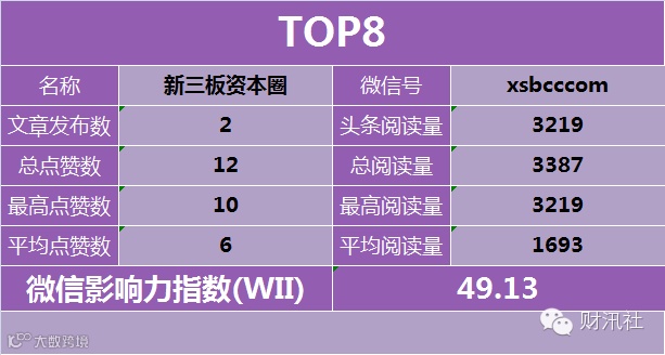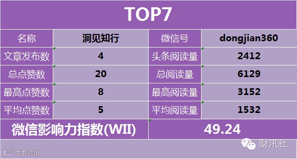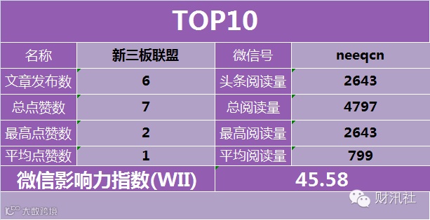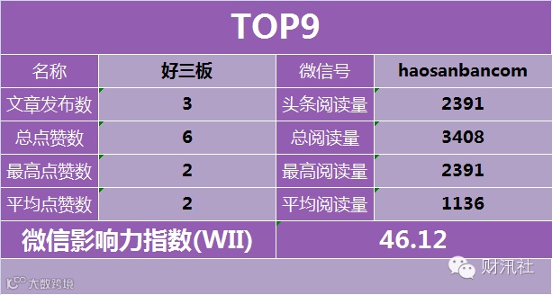 9微信影响力指数(WII):根据公众号的头条阅读量、总阅读量、最高阅读量、平均阅读量、总点赞数、最高点赞数、平均点赞数等多项公开数据,进行指数加权运算得出,科学全面的反映公众号综合价值的一项指标。
