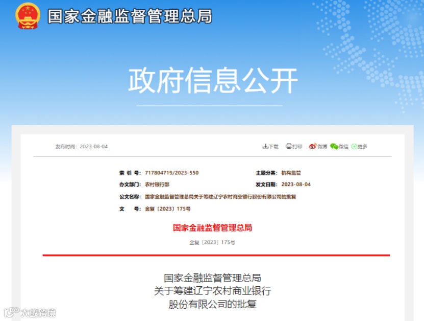 根据金融监管总局披露信息,该局还同意了沈阳农村商业银行与北票市农村信用合作联社等30家农村信用合作联社以新设合并方式组建农村商业银行,机构名称规范为“辽宁农村商业银行股份有限公司”,并要求辽宁省农村商业银行筹建工作小组,自批复之日起6个月内完成筹建工作。