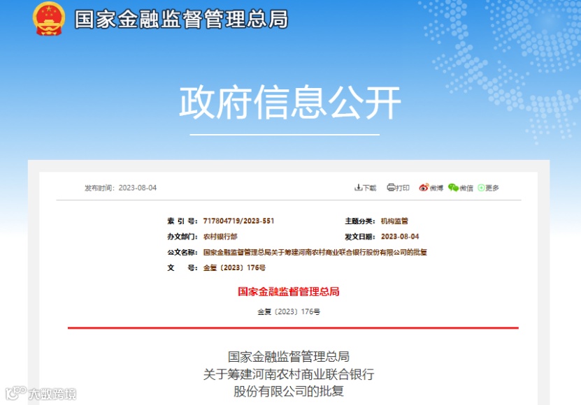 根据金融监管总局作出的批复,该局同意筹建河南农村商业联合银行,要求河南农商联合银行筹建工作小组自批复之日起6个月内完成筹建工作,筹建期间接受河南监管局的监督指导。