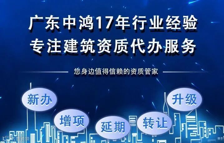 广东中鸿建筑咨询有限公司是一家专业的建筑业资质代办公司。有着17年的行业经验,业务范围包括资质新办、升级、增项、延期、转让等建筑业相关的资质代办服务。致力于帮助各企业安全快速办理各类建筑资质证书!
