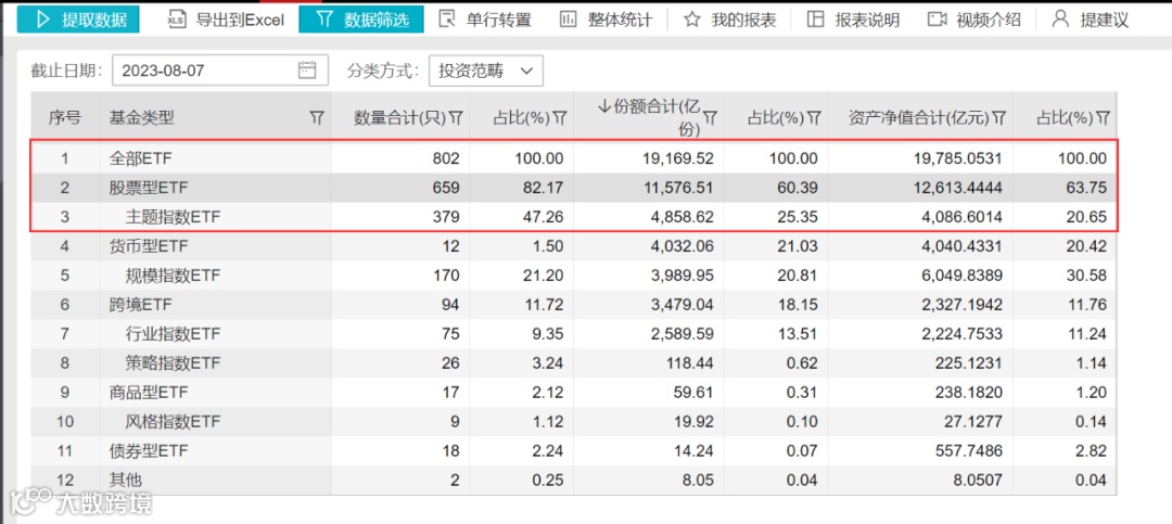 Wind数据显示,截至8月7日全市场ETF达到了802只,总份额为1.92亿份,总规模达1.98万亿元。其中股票型ETF占据绝对优势,659只股票型ETF合计份额和规模分别为1.16万亿份和1.26万亿元,占比均超过60%。