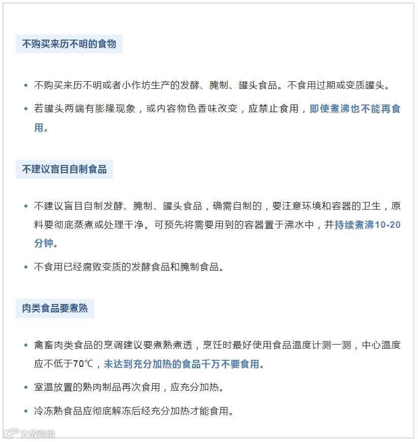 1、既往调查发现,家庭自制发酵食品和腌制食品,往往是引起中毒的“元凶”:如腌肉、腊肉、泡菜、豆豉、豆瓣酱、腐乳、臭豆腐。