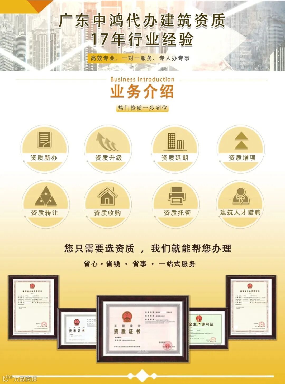 业务范围:资质新办、资质升级、资质增项、资质平移、资质转让