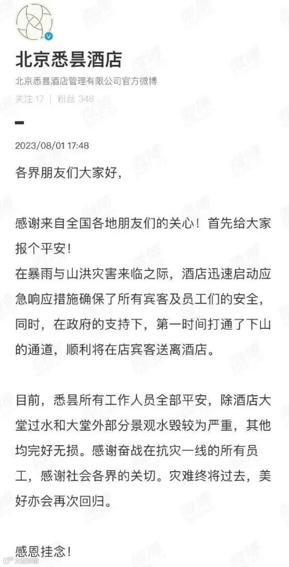 7月31日,“北京顶奢酒店被暴雨冲走了”冲上热搜。8月1日下午,北京悉昙酒店通过多个官方账号报平安:灾难终将过去,美好亦会再次回归。