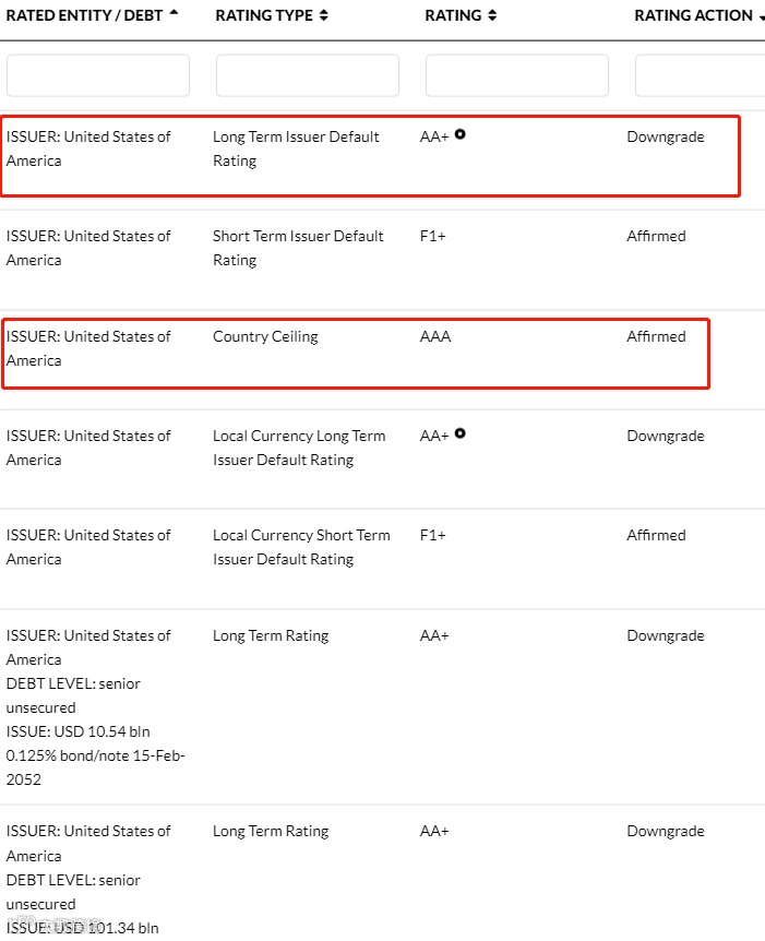 隔夜美国市场意外遭遇“黑天鹅”。当地时间8月1日,全球评级巨头惠誉突然宣布,将美国长期外币债务评级从AAA下调至AA+。这是惠誉自1994年首次发布美国信用评级以来第一次对该国的评级下调。