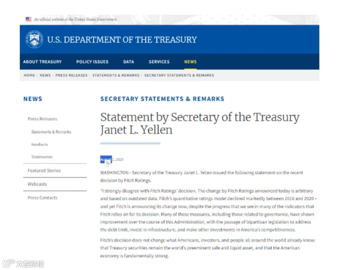 美国财长耶伦就惠誉下调美国评级一事发表声明表示,强烈反对惠誉评级公司的决定,认为惠誉调整美国评级武断的,是基于过时的数据。