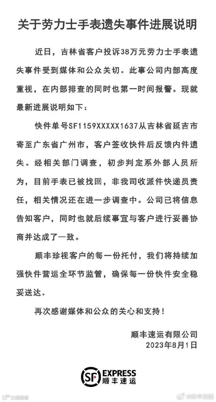 吉林省客户投诉使用顺丰快递价值38万元劳力士手表遗失事件最新进展来了,据顺丰集团1日称,目前手表已被找回,非顺丰收派件快递员责任。