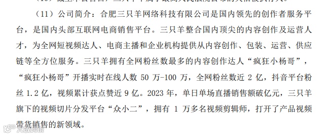 而欧普康视公告中表示,“疯狂小杨哥”开播实时在线人数50万-100万,全网粉丝数近2亿,视频累计获点赞近9亿。2023年单日单场直播销售额破亿元,三只羊旗下的视频切片分发平台拥有1万多名视频剪辑师。