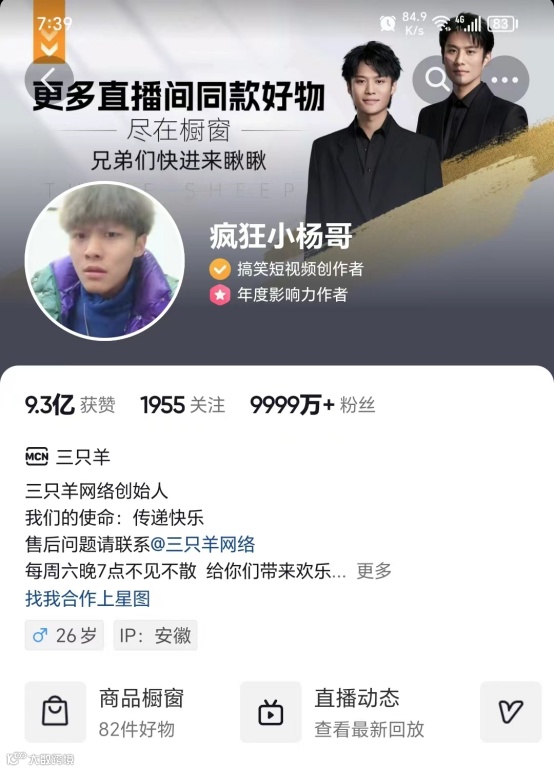 三只羊网络的创始人即号称坐拥过亿粉丝的抖音网红“疯狂小杨哥”。