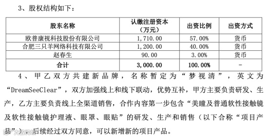 本次交易由欧普康视以货币方式出资1710万元、三只羊网络以货币方式出资1200万元、赵春生以货币方式出资90万元。三方合计出资3000万元,共同出资设立的企业名称初步拟定为合肥欧普三羊眼健康科技有限公司。