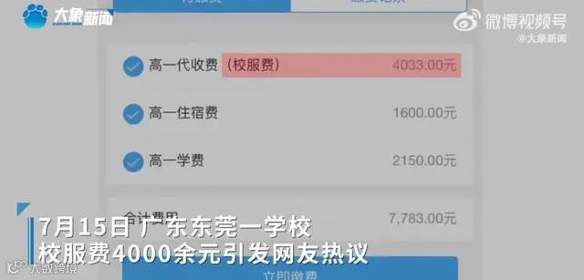 据大象新闻报道,近日,广东东莞一中学发布的新生入学须知提到,学生需缴纳4000余元校服费,引发网友热议。