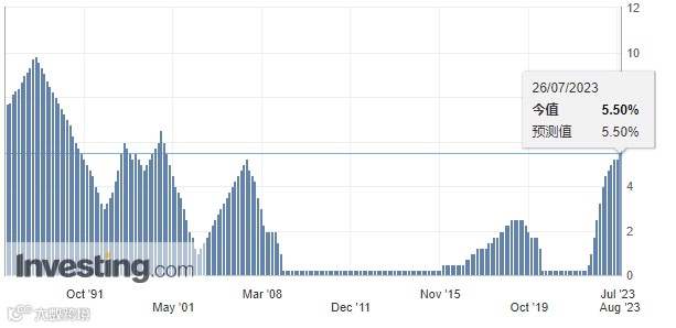 北京时间7月27日凌晨02:00,美联储联邦公开市场委员会(FOMC)宣布,将联邦基金利率的目标区间上调至5.25%到5.5%,加息幅度25个基点,升至2001年以来的最高水平。