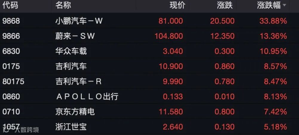 港股汽车板块同样强势。其中,小鹏汽车涨33.88%,蔚来、华众车载涨超10%,吉利汽车涨近9%。