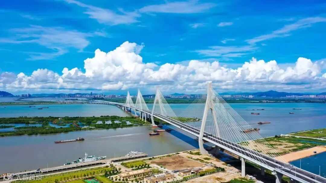 洪鹤大桥东起港珠澳大桥珠海连接线,西接鹤港高速直通黄茅海跨海通道,全长9.654公里,其主航道桥为两座主跨500米的双塔双索面钢叠合梁首尾串联式斜拉桥。