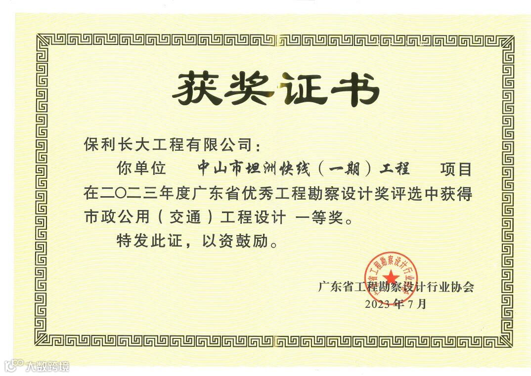 近日,广东省勘察设计协会公布2023年度广东省优秀工程勘察设计奖评选(每两年举办一届)结果,保利长大工程有限公司完成的中山市坦洲快线(一期)工程施工图设计项目成果喜获市政公用(交通)工程设计一等奖。