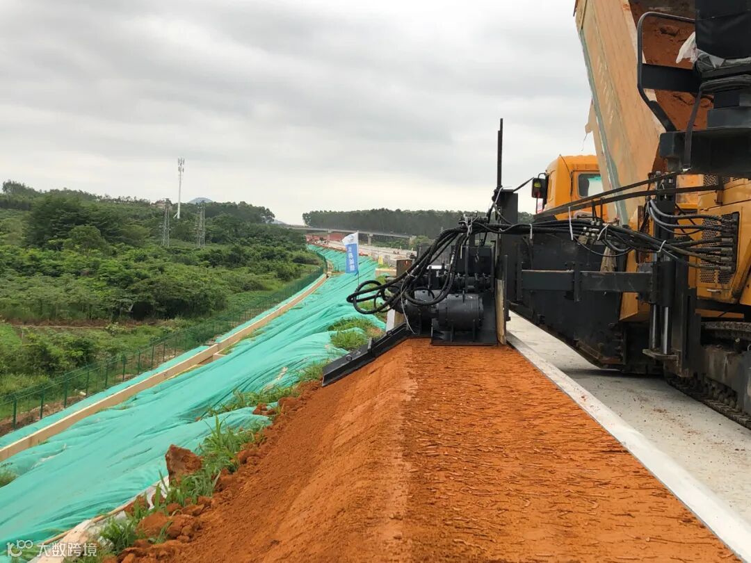 为解决传统土路肩施工存在的质量问题,湛江机场高速TJ1标使用了土路肩摊铺机,实现了培土、夯实、整形同步进行。运载车将土方倒入摊铺机料斗,通过传送带将土摊铺在土路肩位置,振动平板夯同步对土路肩顶部和侧面的填土进行夯实,实现分层培土,分层夯实。