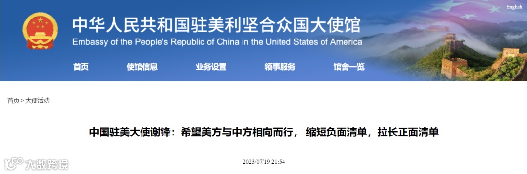 2023年7月19日,中国驻美国大使谢锋应邀出席阿斯彭安全论坛,与旗语新闻社创始编辑克莱门斯举行专场炉边对话。