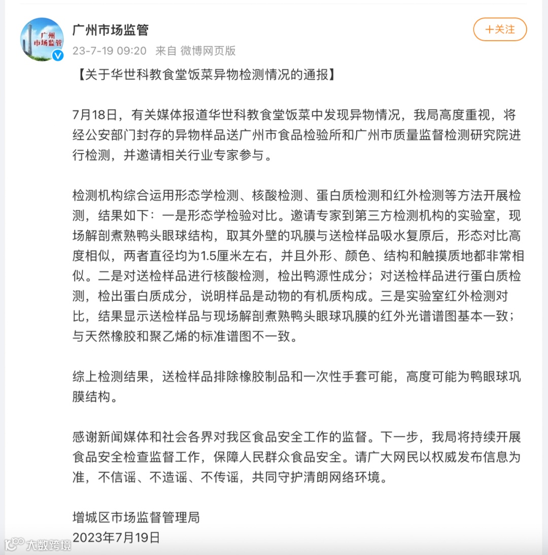 增城区市场监管局表示,7月18日,有关媒体报道华世科教食堂饭菜中发现异物情况,该局高度重视,将经公安部门封存的异物样品送广州市食品检验所和广州市质量监督检测研究院进行检测,并邀请相关行业专家参与。